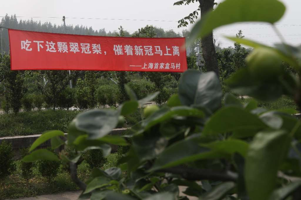 (图说:上海市崇明区,翠冠梨数字农业基地,农民谐音催冠离,让新型冠状病毒赶紧离开)