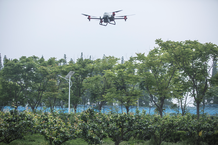 (图说:上海首个盒马村,翠冠梨数字农业基地,无人机正在低空施药。)