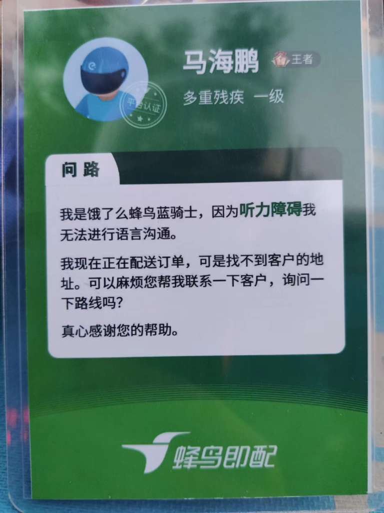 “我是饿了么蜂鸟蓝骑士,因为听力障碍我无法进行语言沟通。我到店来取货,还请帮忙打包……”,在外卖高峰期到店取餐时,马海鹏就会拿出手机,把骑手APP为他定制的信息展示给商家看。“为了帮助无声骑士在工作中更顺畅,针对外卖配送时出现的四个高频场景,我们设计了相应的文本模板。”饿了么产品负责人丁健表示。