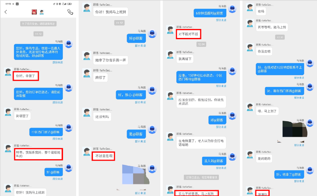 马海鹏的微博叫做“无声的骑士”,他常常会分享一些用户给他的好评和支持,表达自己的感谢。也经常有认出他的用户留言说“有被他的笑容感染到。”不久前,马海鹏晒出了一张“孝心订单”,是一位用户给母亲点外卖。当得知送单骑手是一名无声骑士时,用户接连表示“辛苦了”、“不好意思”、“谢谢你”,老人取单耽误了一些时间,用户又多次给马海鹏留言致歉。