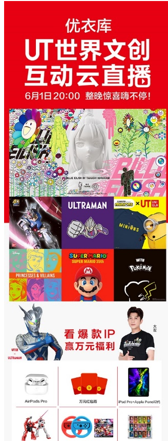 6月1日 20:00,优衣库精心打造UT世界文创互动云直播,将在优衣库官方微信小程序以及天猫优衣库官方旗舰店同步火热直播,爆款人气UT云集,还有跨次元表演、神秘嘉宾、重磅福利,整晚惊喜享不停,开启生活创造力!