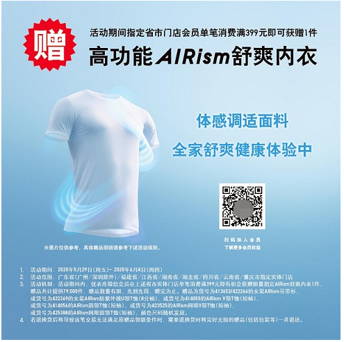 高功能 AIRism 舒爽内衣体验,开启健康活力新生!5月29日-6月4日,优衣库微信会员在优衣库指定8省/直辖市实体门店单笔消费满399元,即有机会获赠限量指定AIRism舒爽内衣1件,AIRism体感调适面料,接触冷感、轻盈透气,带给全家顺滑舒爽的健康体验!(赠品共计提供79,000件,数量有限,先到先得,赠完即止)