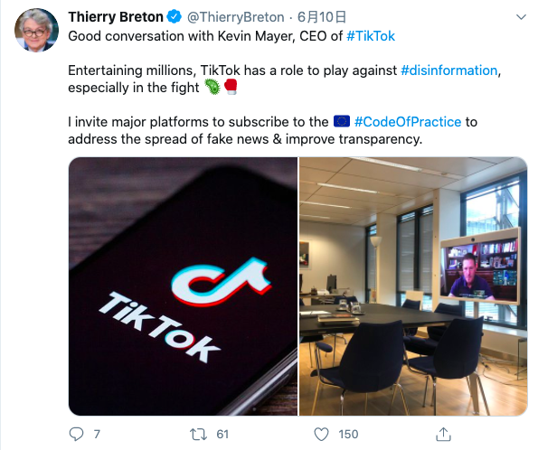 据路透社报道,6月10日,欧盟专员蒂埃里·布雷顿(Thierry Breton)发推文说他与梅耶尔进行了“良好的交谈”。他补充道,“作为娱乐了数亿人的内容平台,TikTok在打击虚假信息上扮演着重要角色,尤其是在抗击疫情上。”