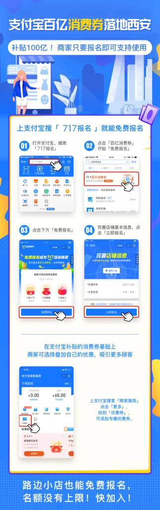 商家主动报名的数量还在增多。支付宝方面表示,活动开始后,商家依然可以在支付宝搜索「717报名」完成报名,报名成功后实时生效。