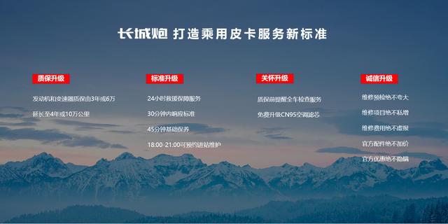 长城炮从产品上超越合资,从销量上完胜合资,在服务上比肩豪华车。为此,长城炮对皮卡售后服务进行了“四维升级”,打造乘用皮卡行业服务新标准。