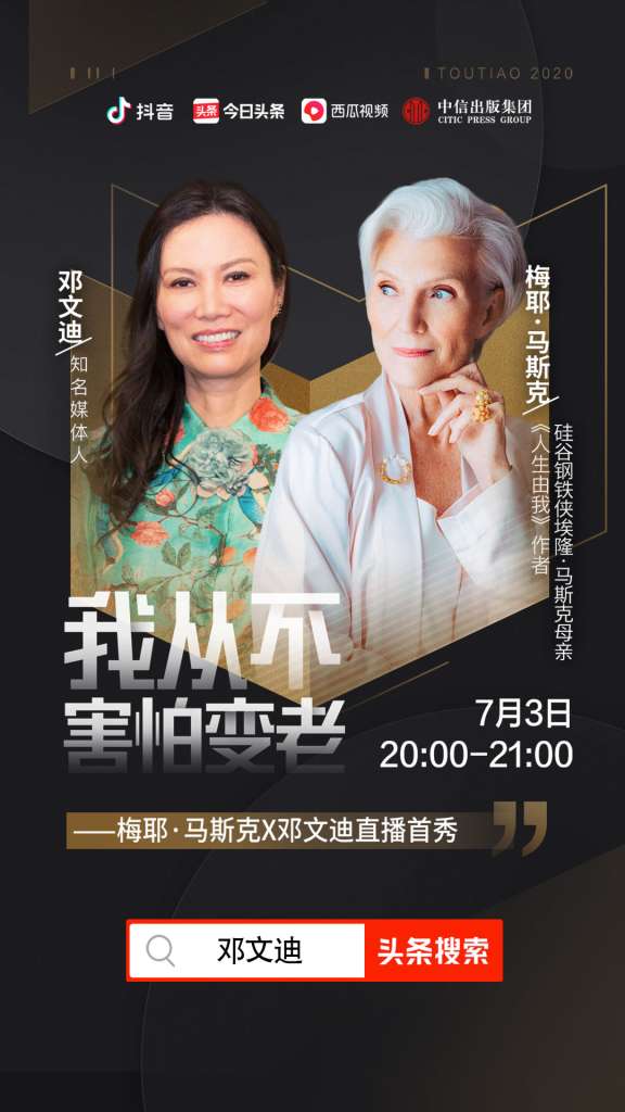 7月3日晚8点,梅耶·马斯克、邓文迪直播首秀将上线今日头条、抖音等平台。这场对谈主题为“我从不害怕变老”,将围绕梅耶的中文版自传《人生由我》展开。用户在上述平台中搜索“邓文迪”即可观看直播,参与互动讨论。