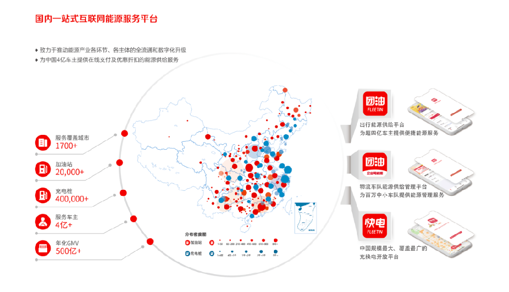 能链成立于2016年,4年来构建了覆盖1700余城市的油、电一体化服务网络,其中10万人口以上行政区覆盖率超过40%。旗下团油平台连接2万余座加油站,快电平台连接40余万根充电桩,分别为国内最大的职业司机加油平台和充换电平台,面向近4亿车主提供服务;旗下能链SaaS为超过1万座油站提供SaaS服务。