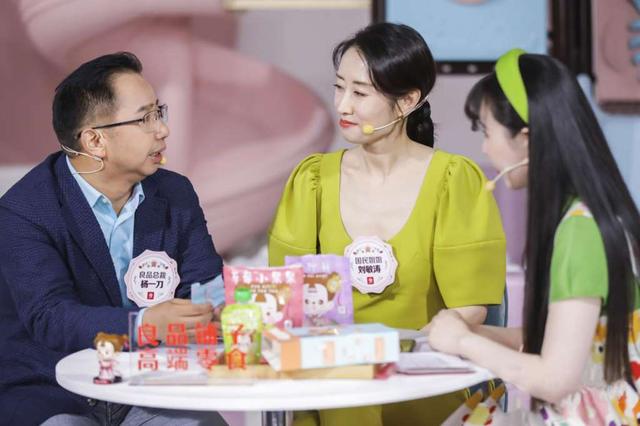 良品铺子总裁杨银芬(左)和演员刘敏涛(中)携手直播