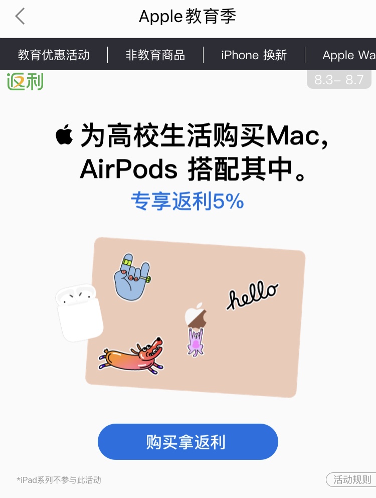 8月3日-8月7日,返利网携手苹果官网推出“Apple教育季”专场。这是继返利网x苹果官网“38硬糖女神节”、“520凭‘果’爱你”活动之后,双方的三度联手,旨在让学生一族买更好省更多。