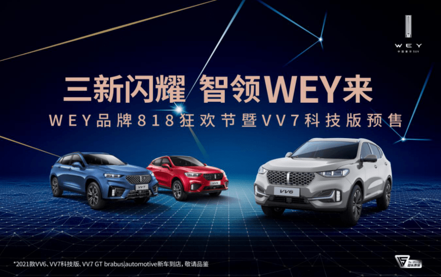 8月16日,WEY品牌联动300百余家经销商,在全国上百个城市同期开启了“三新闪耀 智领WEY来”WEY品牌818狂欢节暨VV7科技版预售活动。数百家媒体、行业大咖倾情助阵,共同见证以VV7科技版领衔的购车狂欢节日,一跃成为818购物狂欢中最活跃的汽车元素。
