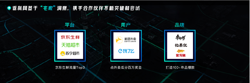 平台侧,返利网携手京东生鲜、天猫超市等头部企业,定制化产品、强化内容种草,助力其快速拓展市场,目前,返利网已成为京东生鲜流量TOP3的供应方。用户侧,返利网加大了外卖场景的发力,加深了与外卖巨头的合作,在每单5%的返利基础上,携手饿了么推出“叫外卖瓜分百万红包”营销行动,帮用户省钱,助力合作伙伴加速超车,广受好评。如今,外卖已成为返利网端内的重要用户场景。品牌侧,返利网推出#吃货星球#频道,携手康师傅、拉面说、金龙鱼等品牌打造专享食品钜惠专场,推出逾百项爆款折扣好物、美食尖货,协同合作方共同寒冬。