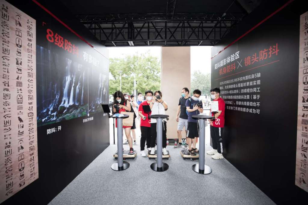 EOS R5和EOS R6首次搭载了机身5轴防抖,搭配使用支持光学防抖的镜头时,通过机身和兼容镜头的协同工作,最大可实现8级抖动补偿效果,即使手持低速快门拍摄也能拍出清晰高画质图像。在防抖体验区中,每台相机前都摆放了一个甩脂仪,来宾在全身都剧烈抖动的情况下仍可以轻松且快速的对焦体验区墙壁上的字画。EOS R5、EOS R6在搭配使用带防抖功能的镜头时,还可以直接通过镜头上的防抖开关来操控机身的防抖功能开启,非常方便。