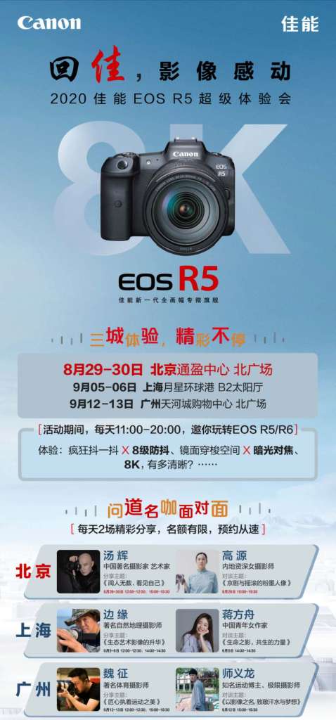 EOS R5和EOS R6的优势无需强调,只需现场体验过,便可领略它的风采。据了解,超级体验会还将陆续在上海(9月2日-3日环球港 B2F太阳厅)、广州(9月12日-13日天河城购物中心北广场)两地举行。对EOS R5感兴趣的观众,可以通过佳能中国官方微信进行预约。精彩,不能错过。