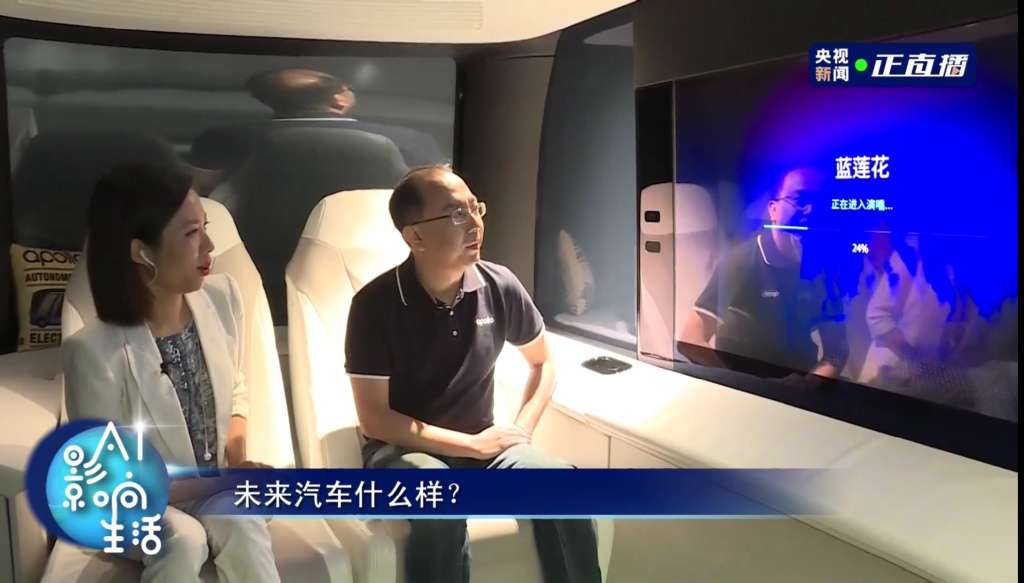 在首钢园区,李震宇还带宝晓峰体验了无人驾驶时代的汽车空间——阿波龙未来驾舱。在这个没有方向盘,却拥有星空顶、大沙发、大液晶电视的空间内,乘客可以舒服的坐在沙发上,完全用智能语音遥控看电影、唱KTV等。