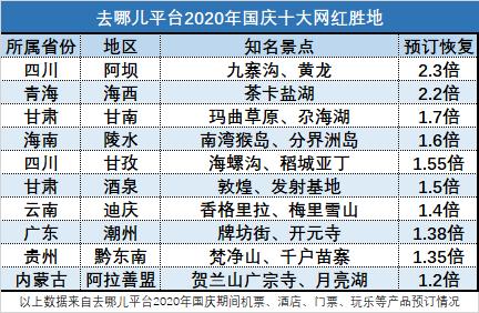 去哪儿平台综合机票、酒店、门票、玩乐等多项预订数据发现,以四川、青海、甘肃、云南、贵州、内蒙古为主的西部地区,热度同比去年还要高。特别是四川的阿坝、青海的海西,各项旅游产品销量同比增了1倍以上,成为今年国庆绝对的热门。