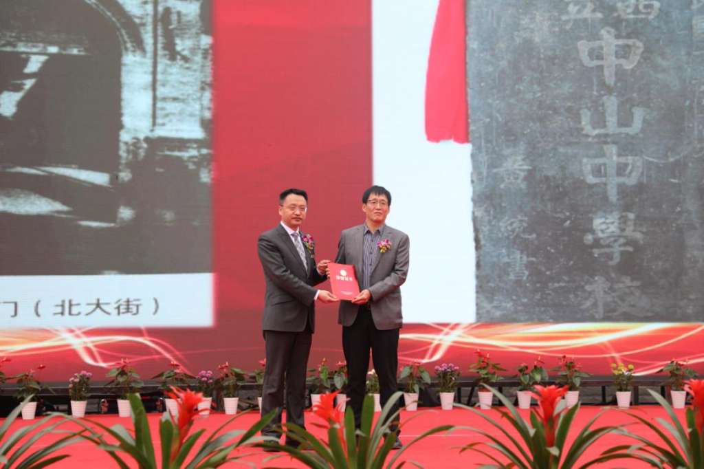 随后,现场播放了校友和陕西师大附中教育联合体的祝福视频。陕西师大附中党委书记陈勇刚向捐赠“陕西省立中山中学校”校名碑石的捐赠人齐志同志颁发捐赠证书。