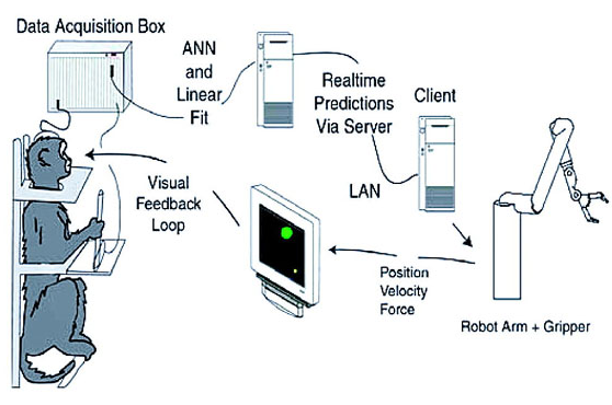 有意思的是,他们进一步将其应用到恒河猴上,不过这一次是先把恒河猴和机械臂进行关联,再让机械臂实时模拟猴子的动作。很快,猴子学会了这一套操作,并似乎在某种程度上理解了这种操控。接下来猴子就安静不动了,纯粹依靠自己的意识来遥控机械臂,就仿佛机械臂长在自己身上一样。