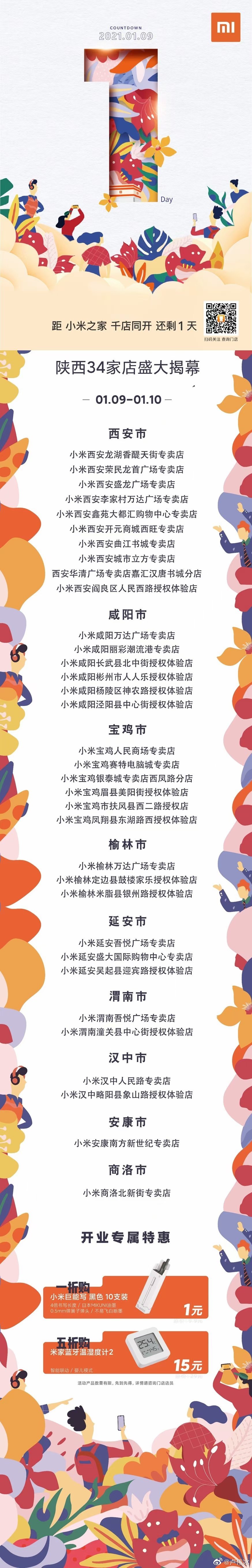 1月9日,迈入新十年的小米公司以轻装上阵的姿态开启了新零售布局的新版图,不仅刷新了小米之家的开店速度,同时也创造了单日门店新增数量超一千个的新纪录。记者从小米公司获悉,共计1003家小米之家在今日同时开业,新开门店遍及全国30个省,覆盖270个县市。其中,陕西省共有34家门店盛大揭幕,不仅在既有商圈内加密门店,完成了西安龙首商圈、宝鸡通信街商圈等重点商圈的覆盖,也在咸阳、延安等市进一步提高了县份店覆盖率,实现了空白县区的首店“突破”。在未来一年,让每个县城都有小米之家,让每个米粉身边都有小米之家。开业当天到店,更可获得小米巨能写1折购等专属开业特惠。