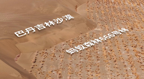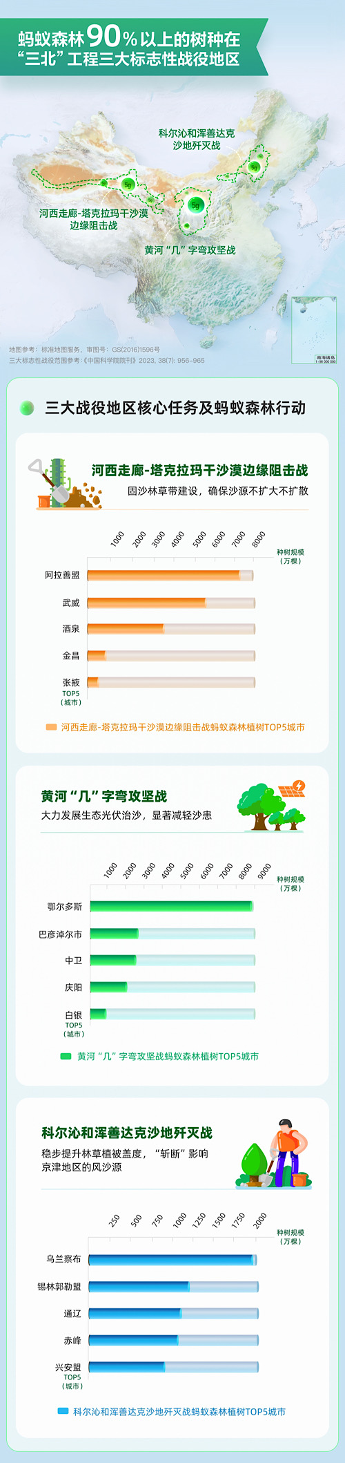甘肃是“三北”工程标志性战役中“河西走廊-塔克拉玛干沙漠边缘阻击战”的核心区域,有绵延上千公里风沙线。2017年,蚂蚁森林在甘肃武威启动种树治沙实践,助力阻止巴丹吉林沙漠和腾格里沙漠在此“握手”。