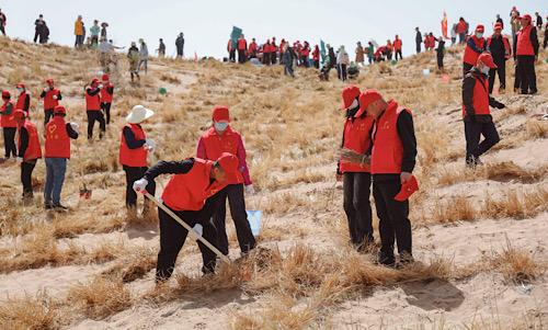 “从一步到一亩、一茬接一茬,只要人进一步,沙子就往后退一步。”4月22日武威种树现场,在沙窝子种了25年树的王银吉再次挥起铁锹,带领民众压沙种树,“心里想着那一抹子绿,脚下的步子都更有劲了!”