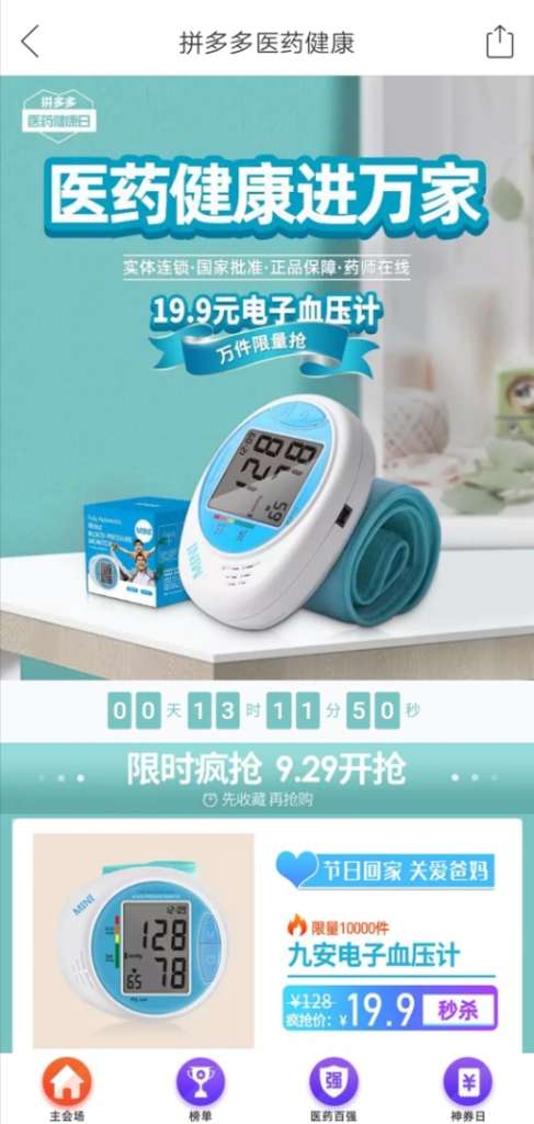 拼多多9月29日将上线“医药健康日”,将重点推出1万台19.9元的九安电子血压计,1万台9.9元的鱼跃血糖检测仪,和最低9.9元的家庭常备药箱等。