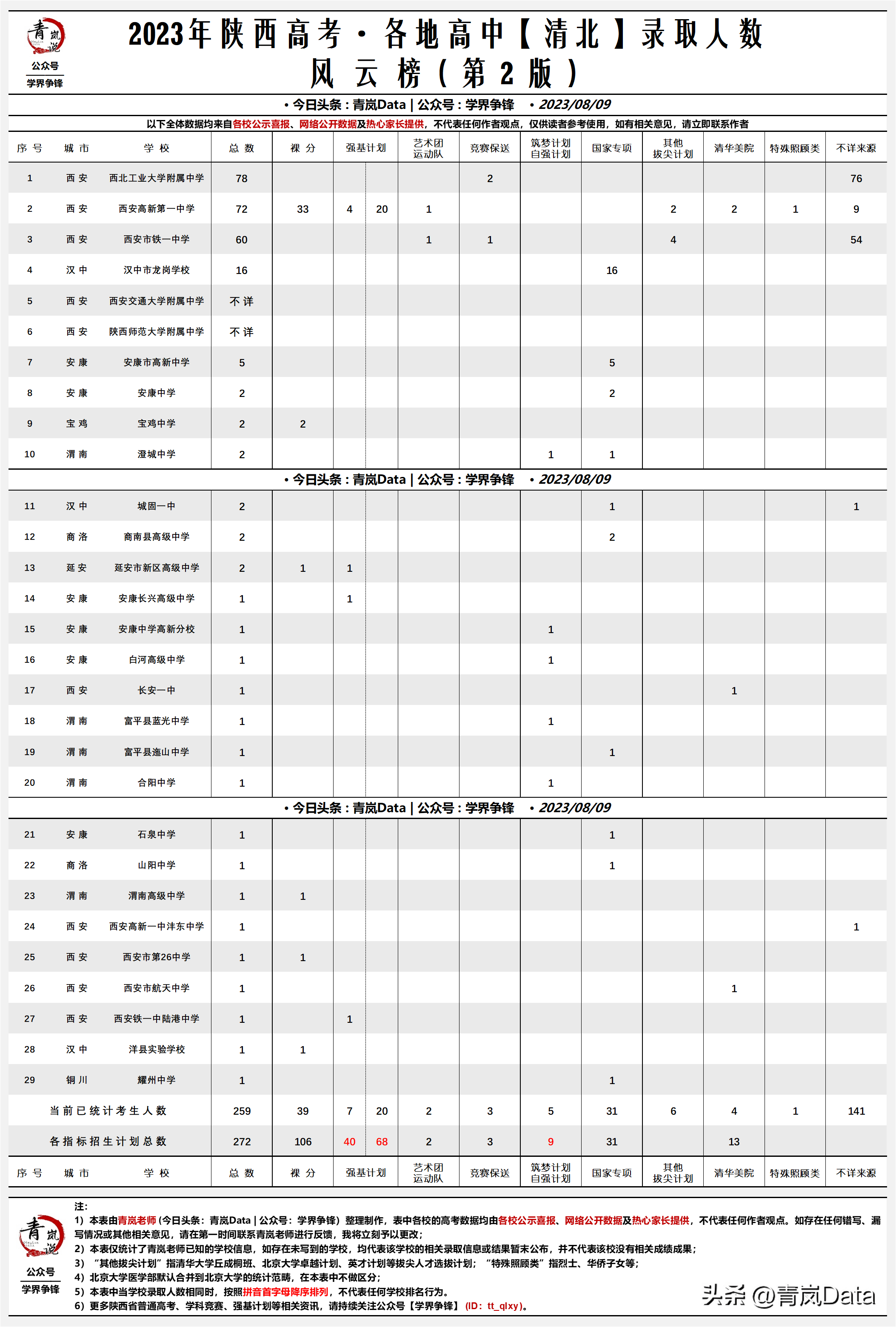 - 西工大附中:没什么悬念,以78人排名第一名,相比去年下降了一点,主要原因在于今年文科发挥得很一般,文一班仅5人考入清华、北大。